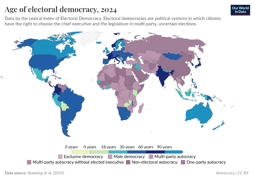 Skaaning et al. (2023) – processed by Our World in Data. “Age of electoral democracy” [dataset]. Skaaning et al., “Lexical Index of Electoral Democracy (LIED) v6.5” [original data]. Retrieved March 28, 2025 from https://refactor-chloropleth-map.owid.pages.dev/grapher/age-of-electoral-democracy-lexical