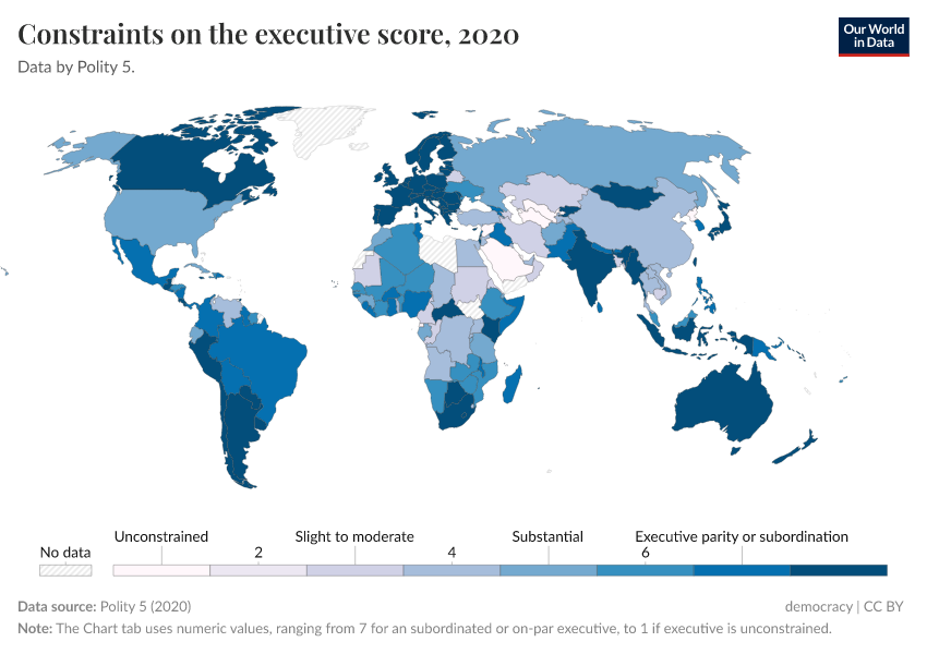 Polity 5 (2020) – processed by Our World in Data. “Constraints on the executive score” [dataset]. Polity 5, “Polity5 Project, Political Regime Characteristics and Transitions, 1800-2018 5” [original data]. Retrieved March 28, 2025 from https://refactor-chloropleth-map.owid.pages.dev/grapher/constraints-on-the-executive-score