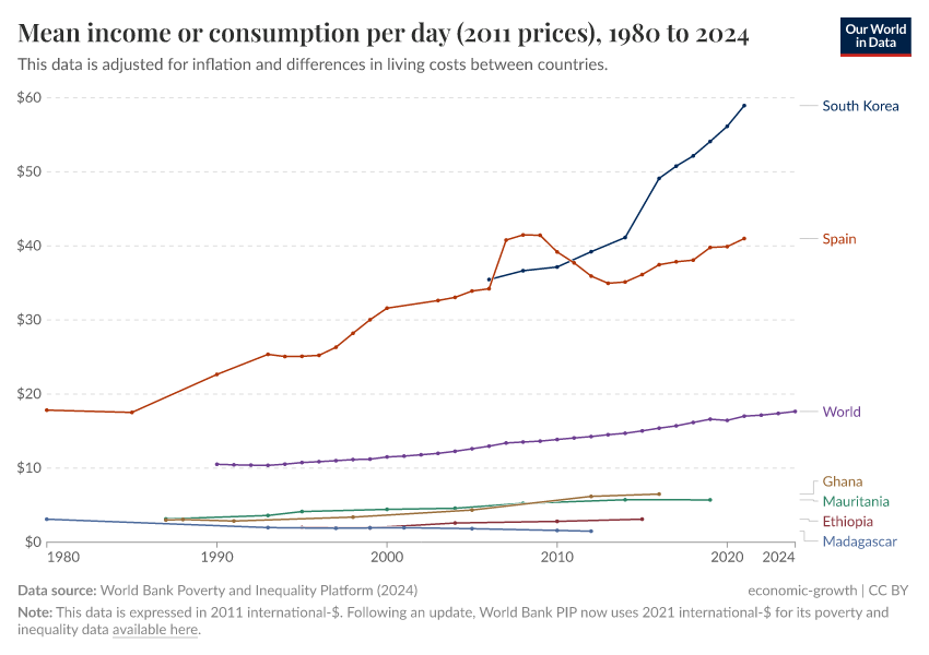 World Bank Poverty and Inequality Platform (2024) – processed by Our World in Data. “Mean income or consumption” [dataset]. World Bank Poverty and Inequality Platform, “World Bank Poverty and Inequality Platform (PIP) 20240627_2017, 20240627_2011” [original data]. Retrieved March 28, 2025 from https://refactor-chloropleth-map.owid.pages.dev/grapher/daily-mean-income-2011-ppp