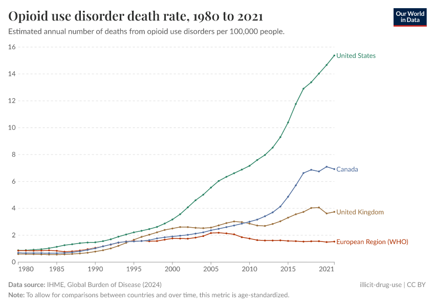 “Data Page: Opioid use disorder death rate”, part of the following publication: Esteban Ortiz-Ospina and Max Roser (2016) - “Global Health”. Data adapted from IHME, Global Burden of Disease. Retrieved from https://refactor-chloropleth-map.owid.pages.dev/grapher/death-rate-from-opioid-use [online resource]How to cite this data