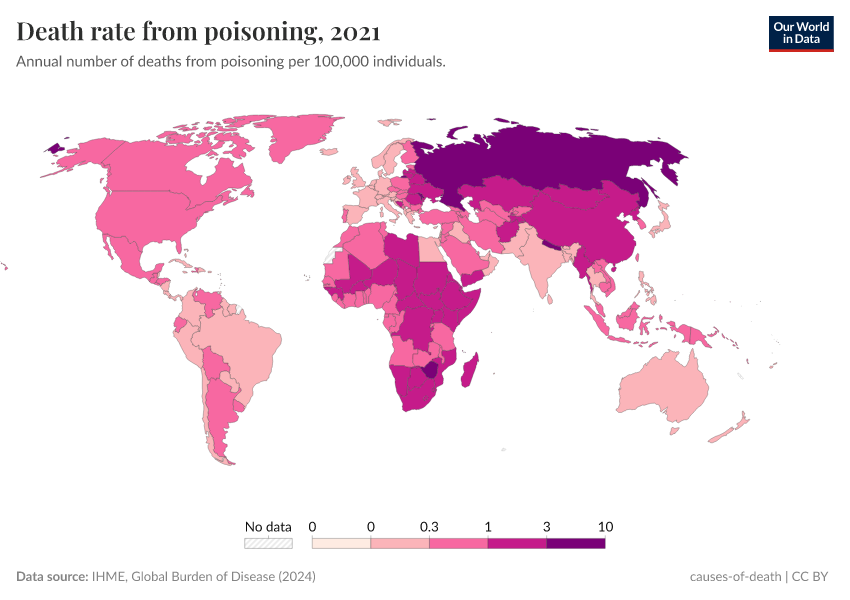 IHME, Global Burden of Disease (2024) – with minor processing by Our World in Data. “Death rate from poisoning” [dataset]. IHME, Global Burden of Disease, “Global Burden of Disease - Deaths and DALYs” [original data]. Retrieved March 28, 2025 from https://refactor-chloropleth-map.owid.pages.dev/grapher/death-rate-from-poisoning-gbd