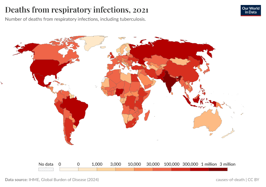 IHME, Global Burden of Disease (2024) – with minor processing by Our World in Data. “Deaths from respiratory infections” [dataset]. IHME, Global Burden of Disease, “Global Burden of Disease - Deaths and DALYs” [original data]. Retrieved March 28, 2025 from https://refactor-chloropleth-map.owid.pages.dev/grapher/deaths-from-respiratory-infections