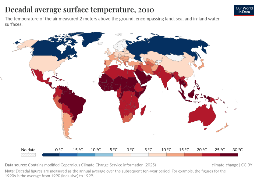 Contains modified Copernicus Climate Change Service information (2025) – with major processing by Our World in Data. “Decadal average surface temperature” [dataset]. Contains modified Copernicus Climate Change Service information, “ERA5 monthly averaged data on single levels from 1940 to present 2” [original data]. Retrieved March 28, 2025 from https://refactor-chloropleth-map.owid.pages.dev/grapher/decadal-average-surface-temperature