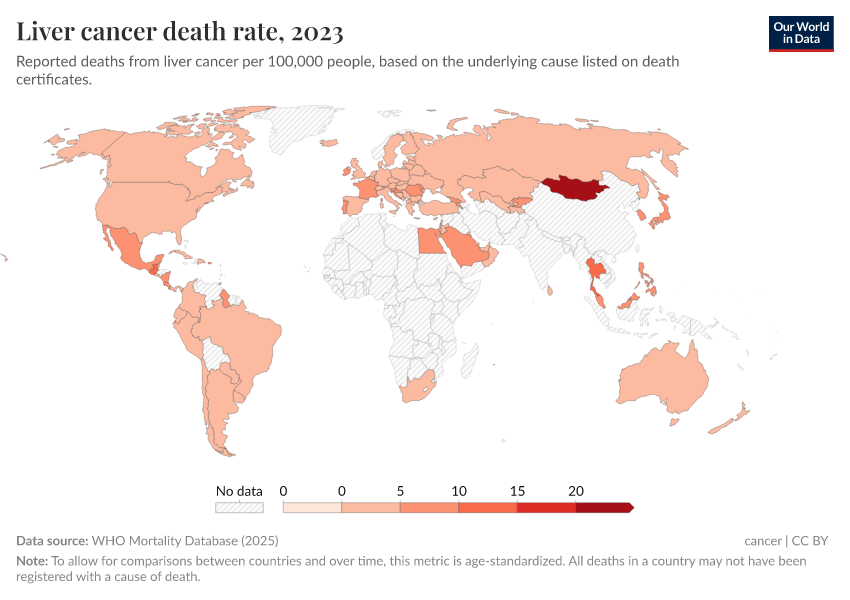 WHO Mortality Database (2024) – with minor processing by Our World in Data. “Liver cancer death rate” [dataset]. WHO Mortality Database, “WHO Mortality Database” [original data]. Retrieved March 28, 2025 from https://refactor-chloropleth-map.owid.pages.dev/grapher/liver-cancer-death-rate