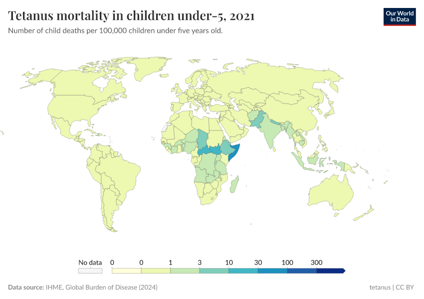 IHME, Global Burden of Disease (2024) – with minor processing by Our World in Data. “Tetanus mortality in children under-5” [dataset]. IHME, Global Burden of Disease, “Global Burden of Disease - Deaths and DALYs” [original data]. Retrieved March 28, 2025 from https://refactor-chloropleth-map.owid.pages.dev/grapher/tetanus-mortality-in-children-under-5