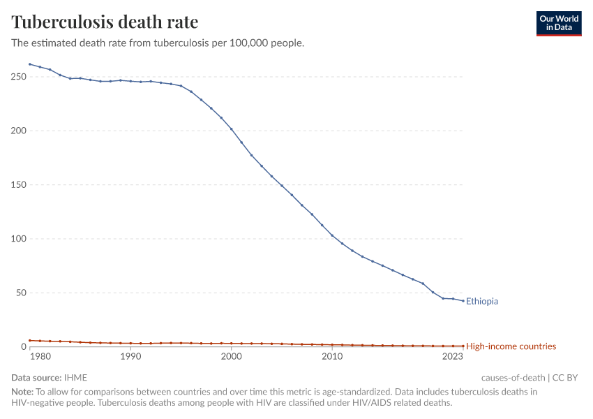 IHME, Global Burden of Disease (2024) – with minor processing by Our World in Data. “Tuberculosis death rate” [dataset]. IHME, Global Burden of Disease, “Global Burden of Disease - Deaths and DALYs” [original data]. Retrieved March 28, 2025 from https://refactor-chloropleth-map.owid.pages.dev/grapher/tuberculosis-death-rates
