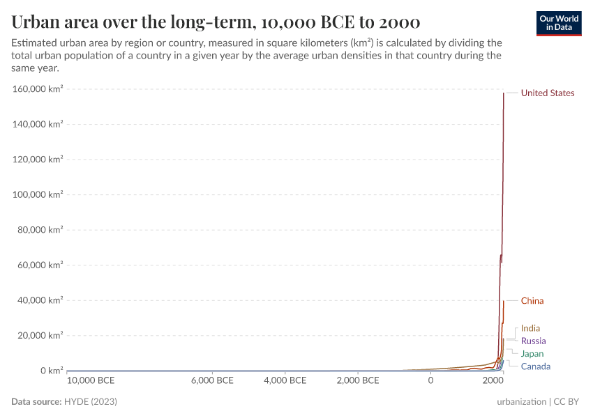 HYDE (2023) – with minor processing by Our World in Data. “Urban area over the long-term” [dataset]. PBL Netherlands Environmental Assessment Agency, “History Database of the Global Environment 3.3” [original data]. Retrieved March 28, 2025 from https://refactor-chloropleth-map.owid.pages.dev/grapher/urban-area-long-term