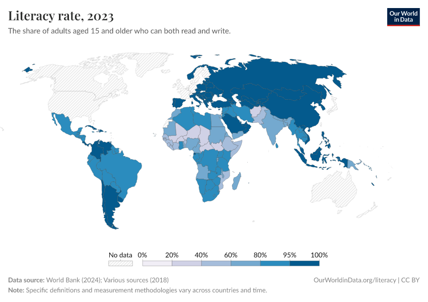 Max Roser and Esteban Ortiz-Ospina (2018) - “Literacy” Published online at OurWorldinData.org. Retrieved from: 'https://refactor-chloropleth-map.owid.pages.dev/literacy' [Online Resource]BibTeX citation